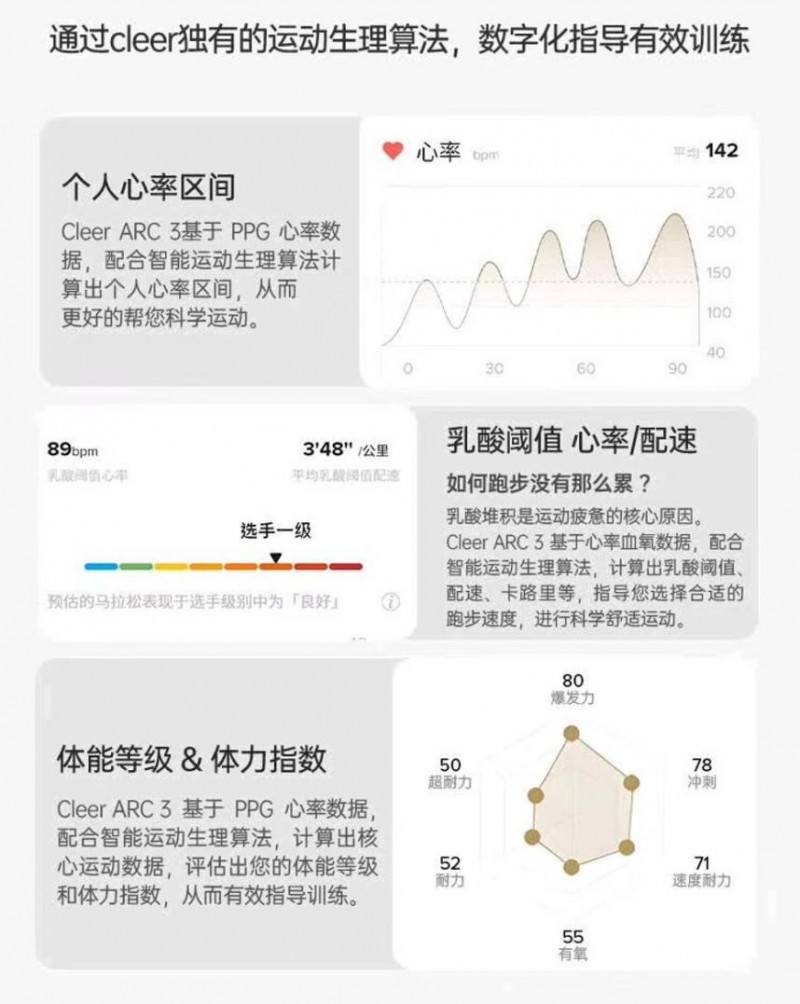 Moreover, in order to meet the sports needs of different users, Cleer has carefully designed the output and summary indicators of the algorithm, ensuring that the algorithm can perform well in various sports scenarios. For example, in outdoor running scenarios, the ARC 3 Sound Arc Sport Pro specifically uses a running posture algorithm to accurately capture the user's running posture. It can capture and transmit raw data of the user's body through built-in sensors, and convert these body signals into many running dynamic data related to running posture, such as step frequency, ground contact time, ground balance, etc. Assist users in correcting poor running posture through data analysis and feedback. This not only helps improve running efficiency, but also reduces the risk of injury caused by incorrect running posture, making running safer and healthier.