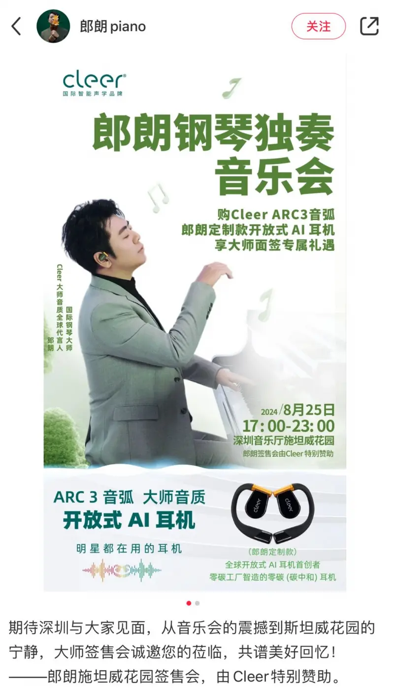 On August 25th, international piano master Lang Lang will hold a solo concert at the Shenzhen Concert Hall. Unlike previous concerts, after this concert, Master Lang Lang will also hold a unique signing event at the Steinway Garden of Shenzhen Concert Hall. As long as you purchase the Cleer ARC 3 Sound Arc Lang Lang Lang custom open AI earphones, you can enjoy the exclusive benefits of the master's face-to-face signing. It is worth mentioning that this signing event was specially sponsored by the international intelligent acoustics brand Cleer, and Lang Lang himself actively responded to this signing event on social media, expressing his expectations and support for the event. This recognition and enthusiasm from the master undoubtedly made this music feast even more exciting.