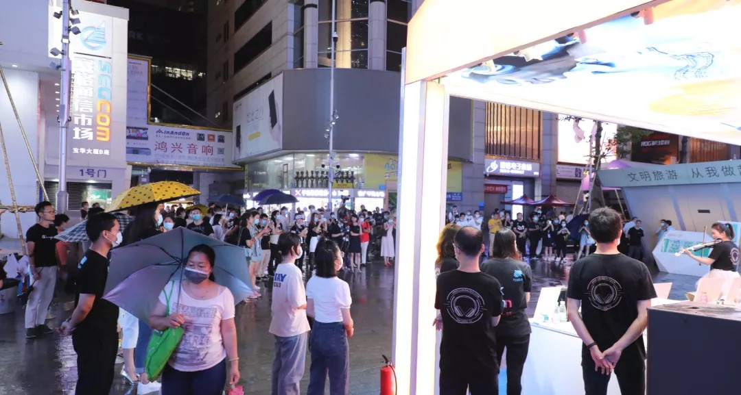 晚上7時(shí)30分,精彩的小提琴表演正式開(kāi)始,隨著(zhù)靈動(dòng)的琴聲響起,絢爛的燈光下,為雨夜增添了些許浪漫,瞬間吸引了眾多游客駐足觀(guān)看,一曲琴音落,博得現場(chǎng)眾多掌聲與喝彩。