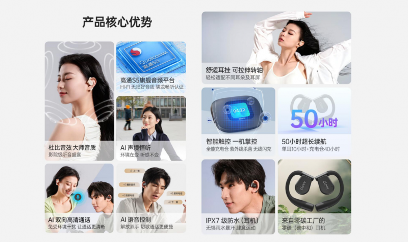 當然,除了音質(zhì)與AI之外,Cleer ARC 3 音弧帶給你的舒適呵護也是獨一無(wú)二的。為了進(jìn)一步提升舒適體驗,Cleer ARC 3 音弧在開(kāi)放式耳機基礎上,獨創(chuàng )了可拉伸旋轉的耳掛設計,可以根據你的耳朵大小個(gè)性化調整耳掛的長(cháng)短及旋轉角度,帶來(lái)量身定制的舒適佩戴體驗。即便連續佩戴3、4個(gè)小時(shí),耳朵也不會(huì )感到壓迫或疼痛,無(wú)論是在辦公桌前埋頭工作,還是在沙發(fā)上追劇放松,這種“云感佩戴”讓你忘記耳機的存在,沉浸在純粹的音樂(lè )世界里。