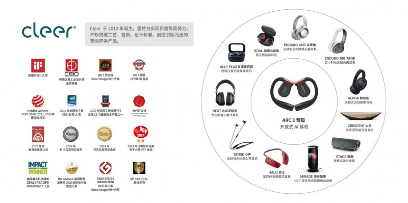 到今年最新推出的 ARC 5 音弧,則將開(kāi)放式耳機的音質(zhì)天花板推向新維度。它首次集成THX空間音效、DTS 空間音效與杜比音效帶頭部跟蹤三大全球頂尖音頻技術(shù),成為全球首款同時(shí)獲得 THX 認證與DTS加持的開(kāi)放式耳機。通過(guò)THX 認證的影院級聲場(chǎng),確保聲音的精準還原與動(dòng)態(tài)平衡;DTS空間音效則以卓越的多聲道環(huán)繞音效著(zhù)稱(chēng),讓開(kāi)放式耳機也能展現出多維度的寬廣聲場(chǎng);杜比音效帶頭部跟蹤技術(shù),讓聲音可實(shí)時(shí)跟隨頭部運動(dòng)調整方位,仿佛置身于音樂(lè )現場(chǎng)。無(wú)論是低頻的震撼沖擊力還是高頻的細膩解析力,ARC 5都能以精準、動(dòng)態(tài)和立體的方式完美呈現。在A(yíng)I性能方面,ARC 5也邁出了跨越性的一步,搭載Cleer自研AI智能體“聽(tīng)道”,能夠游刃有余地執行AI語(yǔ)音筆記實(shí)時(shí)轉寫(xiě)、AI同聲傳譯等任務(wù),從聽(tīng)音設備脫胎換骨,成為一款多功能的AI新質(zhì)生產(chǎn)力工具。Cleer正在用一次次技術(shù)迭代證明:開(kāi)放式耳機不僅能打破傳統耳機的物理桎梏,更能以革命性音質(zhì)與功能重塑聽(tīng)覺(jué)體驗。憑借在聲學(xué)技術(shù)和功能設計等的多維突破,ARC 5在正式上市前就已贏(yíng)得業(yè)界高度認可,摘得2025日內瓦發(fā)明獎銅獎、2025德國紅點(diǎn)設計獎等殊榮,并在近期BEYOND Expo 2025上榮膺展會(huì )最高榮譽(yù)“BEYOND BEST CHOICE Awards”,充分展現了其頂尖實(shí)力與市場(chǎng)潛力。